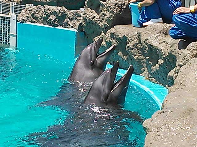 イルカの水槽。係員の方が餌の小魚を与えると、美味しそうに口で転がしながら食べていました。イルカショーでは、軽やかにジャンプを連発します!