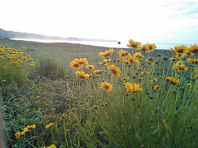 海岸の砂浜に咲く黄色い花。調べたところ、キク科の「ハルシャギク」 という花っぽい。中でも浜辺に咲く、「ハマベハルシャギク」という種類と思われる。きれいでした。(関連記事:4月~5月の草花)