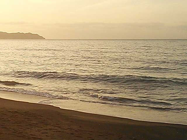 波の穏やかな朝でした。押し寄せる波のうねりの水面に、朝日がピカピカ反射して光り、とてもきれいでした。