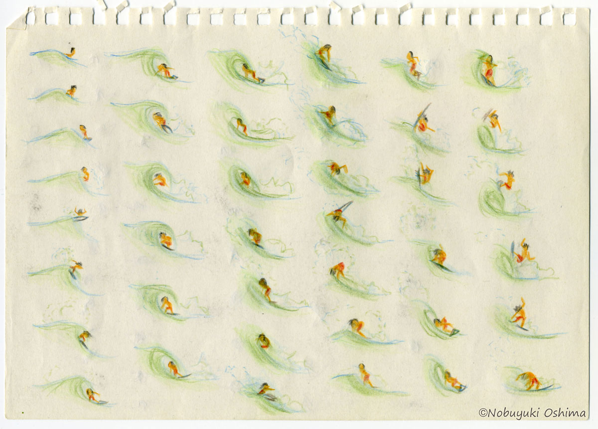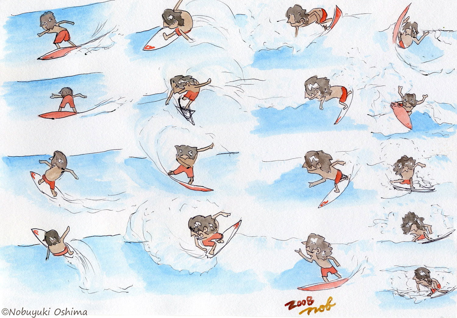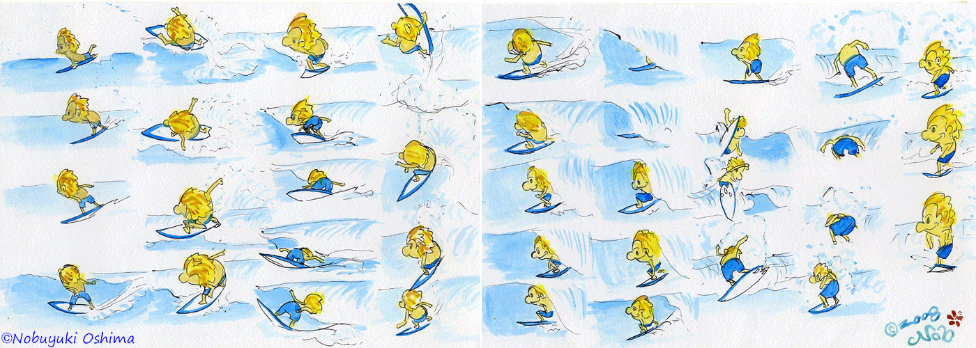 サーフィンのスケッチアニメ動画02[サーファーの波乗りイラストのGIFアニメーション]の原画-Nobuyuki Oshima(大嶋信之)