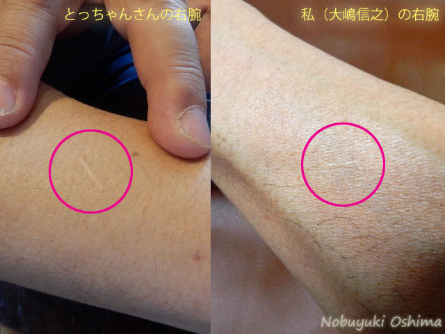 (追記:後日(2025年12月27日)、とっちゃんさんに再び会う機会があったので、この傷跡を見せると「私と同じですね、片方の傷の方が大きい。しかも間隔が3.5cmというのも同じです。私も3~4cmでした。」と仰っていた。)