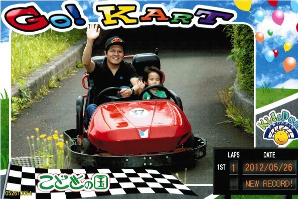 要自動車運転免許の本格ゴーカート。自然の中を風を切って爽快に走れる。記念に上のような写真を買うことができる。自動車免許のない子供がひとりで運転するためには、講習を受けて専門の免許を取得する必要があるようだ。写真のように自動車免許のある親と一緒に乗る分には、子供の免許は必要ない。