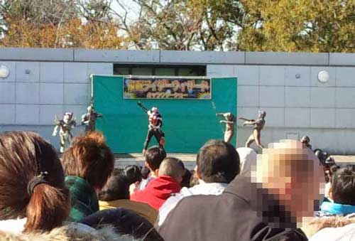 芝生広場の脇にあるステージには、定期的にショーが行われているようだ。写真は、たまたまやっていた仮面ライダーウィザードショーの様子。観客の子供たちは大興奮!笑