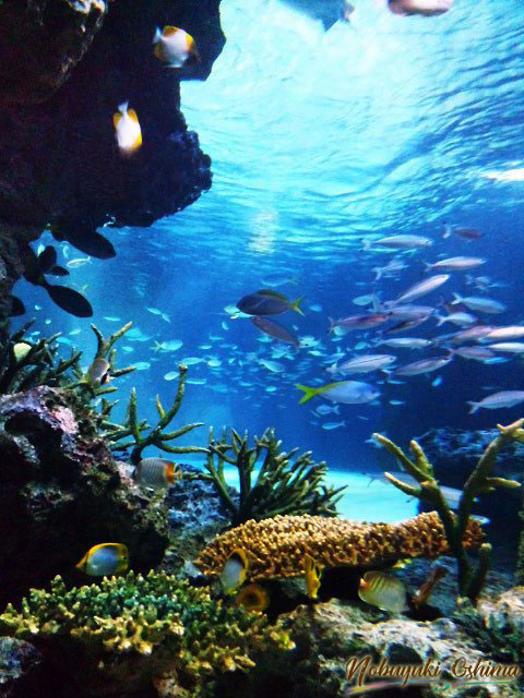 熱帯の海の水槽。サンゴ礁のまわりにたくさんの魚が泳ぐ。とても綺麗。