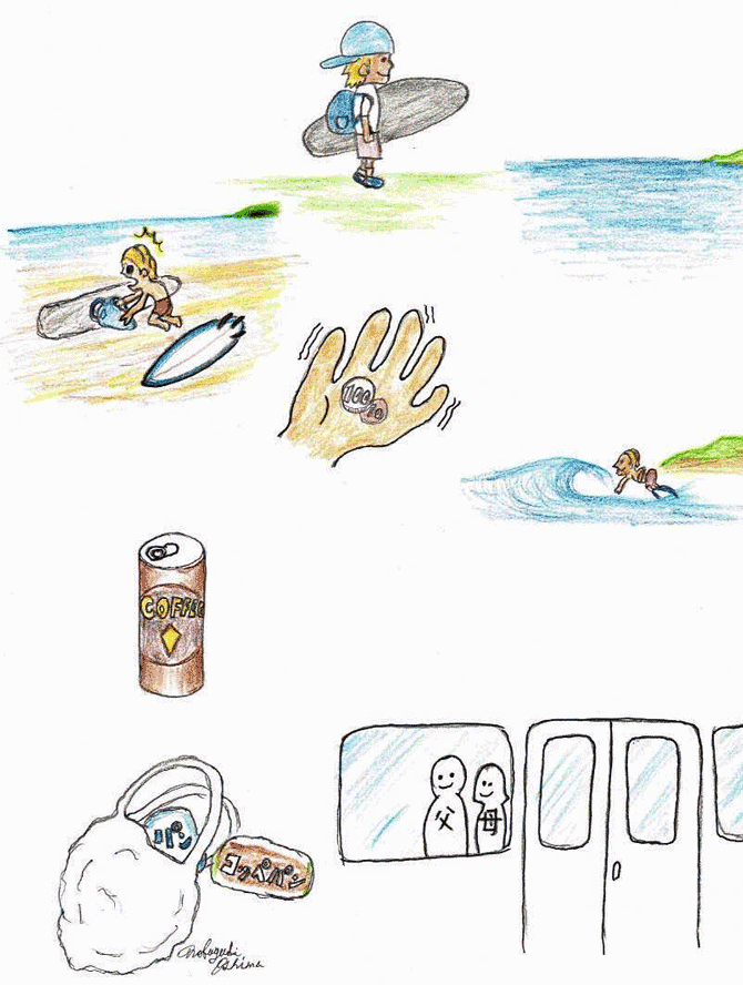 1995年の高校3年生の夏休み(お盆)、茨城県ひたちなか市にある阿字ヶ浦海岸に、電車でサーフィンしに行った時の、ちょっと不思議な話。(→ブログ記事)